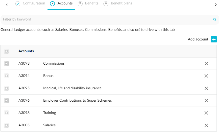 Either click the Budget menu > Add tab or click the Add tab button (at the bottom of the workbook), then select the Headcount tab type. Then proceed to set up the Headcount driver tab. This is where you select the accounts you want to drive with the headcount data and add benefits and benefit plans that are mapped to those accounts. This process involves several steps and settings, which are organized into tabs: