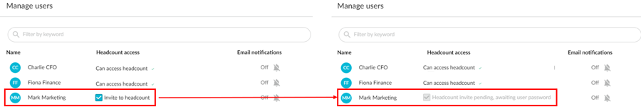 In the Headcount access column, select the Invite to headcount checkbox. The checkbox becomes dimmed and a message informs you the invite is pending.