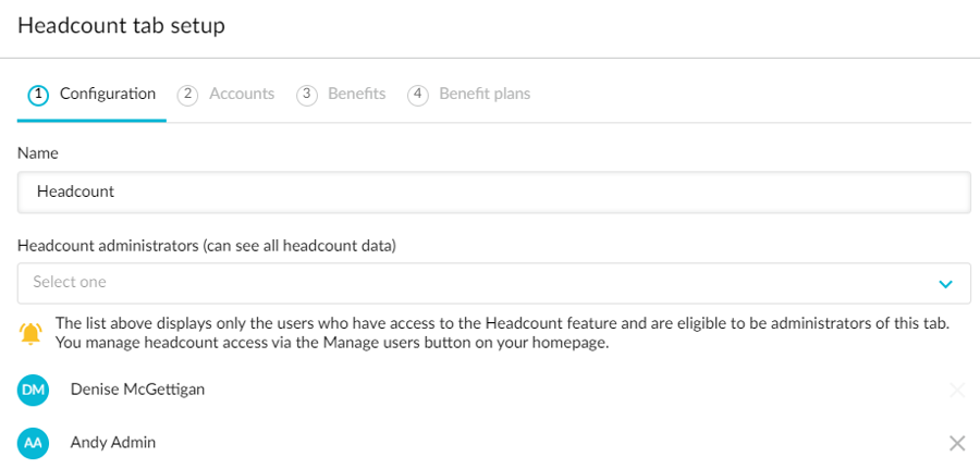 Open the headcount tab setup, select the user’s name from the Headcount administrators list and click Next > Next > Next > Save and finish.