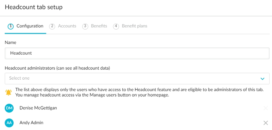 When a user has access to the headcount (has been invited and created a password), their names display in the list of potential administrators in the headcount setup.