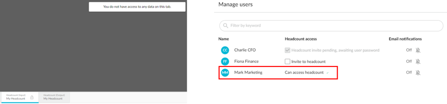 When Mark unlocks the Headcount Input tab, he gains access to the tab but not the data. His access to the data depends on the workflow; he can’t see any data because he hasn’t been assigned to any rows in the headcount workflow. In the Manage users window, Charlie can see that Mark now has access to the headcount and, therefore, is eligible to be assigned some tasks in the workflow.