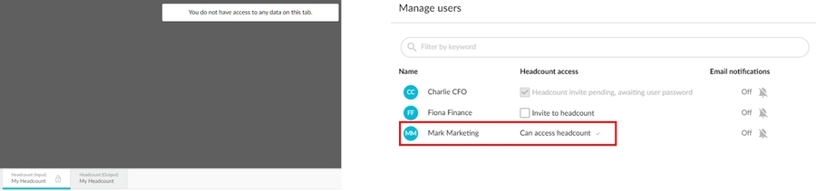 You manage headcount users at a global level, separate from the individual Headcount tab in a workbook. You invite a budget user to be a headcount user, and when they create a password, they can access the headcount tab in which they've been assigned tasks in the workflow.