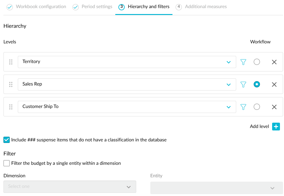 In an operational budget, you must select the dimension you want to add, such as Region, Branch, or Sale Rep. By default, the workflow sits at this level, unless you add other levels. You can add up to five additional levels to sit under the highest level. The maximum number of levels any budget can have is six.