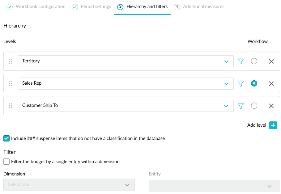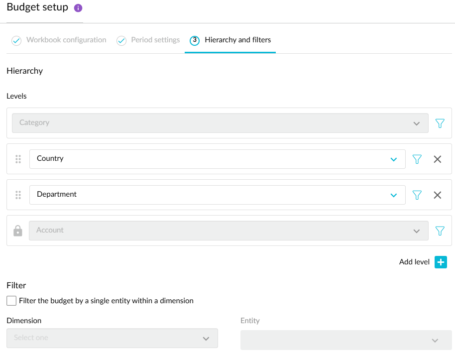 These settings determine how many levels of data are in the budget and how those levels are ordered. In other words, the hierarchy determines how the various dimensions in the database are grouped in the budget. You can leave the default hierarchy as it is or customize it to suit your needs. For example, you can add more levels of detail or apply filters. Many of these settings are optional: