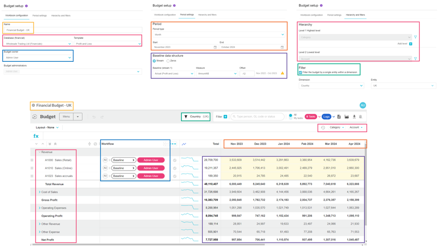 See Create a budget from within a financial statement (one-click budgeting) to see how the financial statement layout matches the financial budget setup.