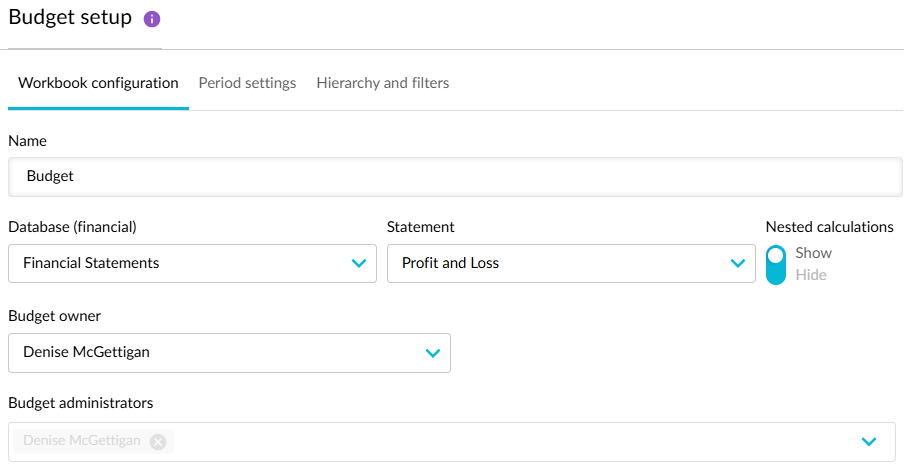 Change the budget owner, if required. By default, you are the budget owner, as you are creating the budget. Typically, you would leave this as is, but you can select another user if you want to delegate the workflow management to them. Learn more about the types of users in Budgets & Forecasts.