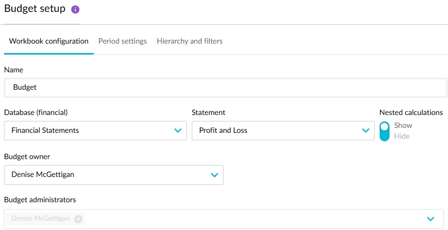 (Financial budgets only) Show or hide nested calculations as required. This setting determines whether nested calculation rows are shown in the budget or not. These calculation rows come from the selected statement. By default, Hide is selected, which means you'll only see the top-level calculation values in the budget. If you want the calculation rows to be expandable, so you can see the nested derived rows underneath, select Show. However, bear in mind that this introduces more data into the budget workbook, which might have a negative impact on performance.
