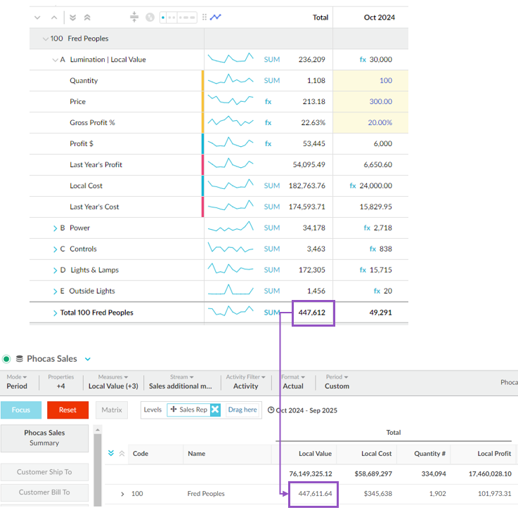 The context of this example is a Sales budget that is organized by Sales Rep > Product Class.
