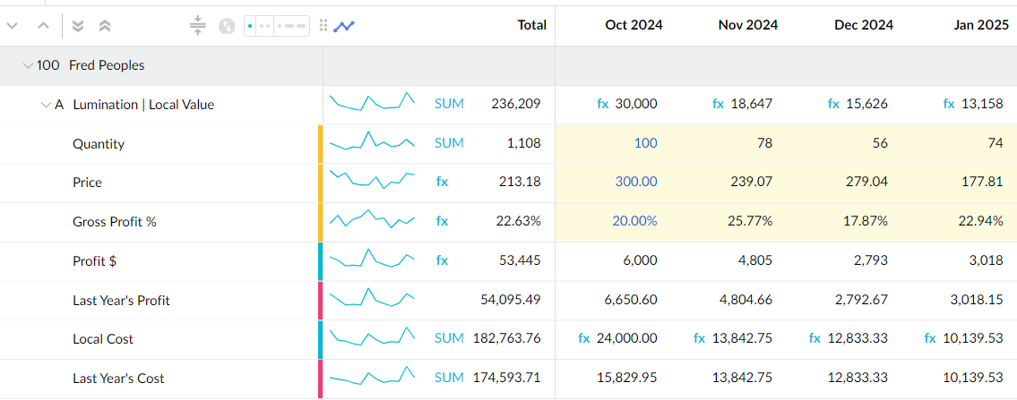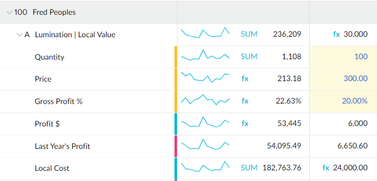 Some measures have a yellow calculator icon next to them to signify they are a calculated measure in the underlying database. Calculated measures are not published to the underlying database. For example, in the image below, you might input the profit when budgeting, however, as this is a calculated measure (Local Value - Cost), it will NOT be published back to the underlying database.