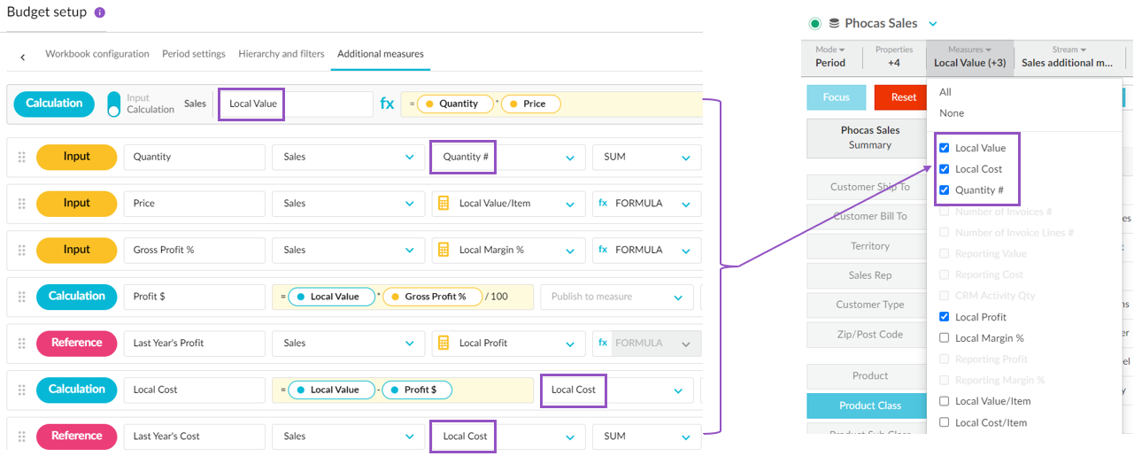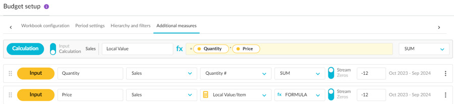 On the Additional measures tab in the budget setup, firstly calculate the Sales Local Value (the quantity that you are going to sell multiplied by the price):