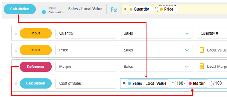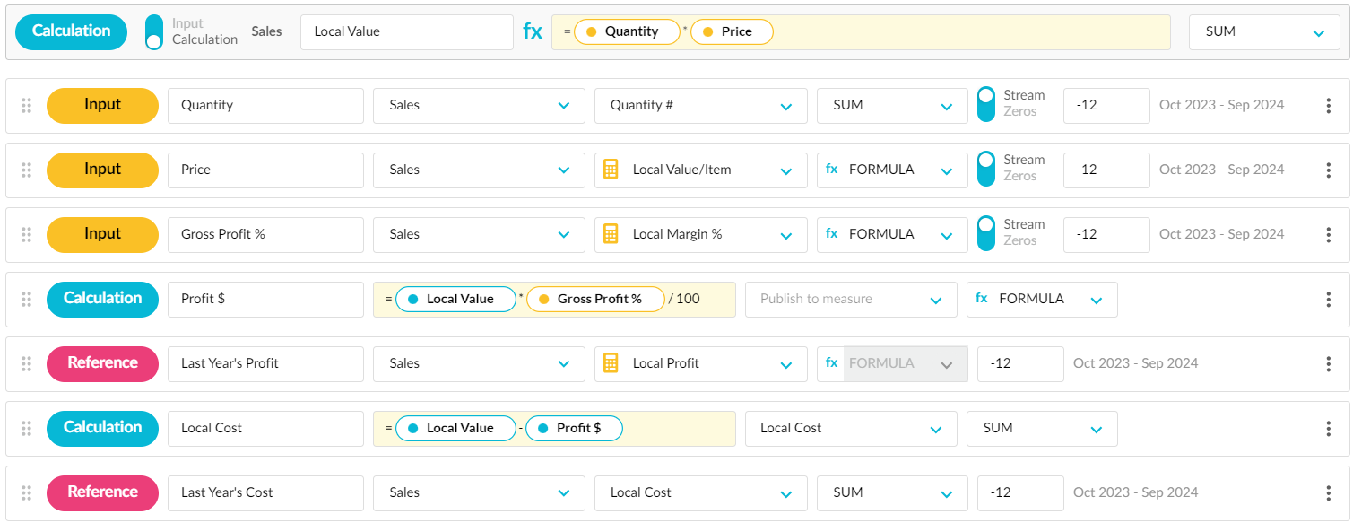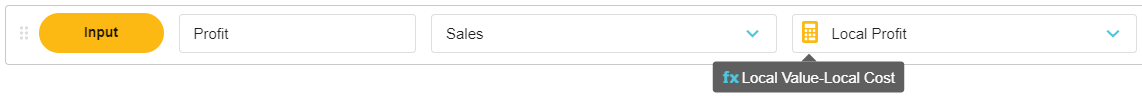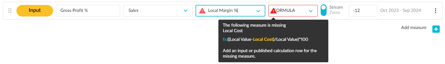 The FORMULA option is selected by default in Calculation rows and Input rows that use a calculated measure. If a red error displays, it means one or more of the formula elements are missing, so you need to either select an alternative aggregation option or add row(s) for the missing element(s). The image below illustrates the latter - the Local Cost measure was missing from the formula, so another Input line was added for that measure.