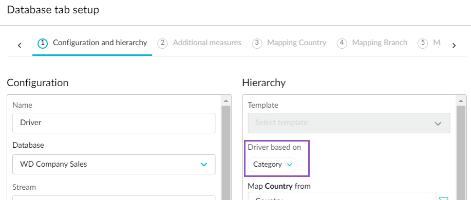 If you are adding rows in the setup of a Database tab, you have the option to configure which of the rows drive the corresponding categories in the Main tab of the budget workbook. Select the Driven toggle button as required.