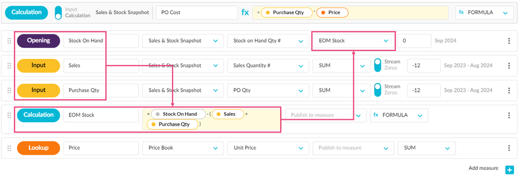Add a calculation row for the end of month stock value (EOM Stock). This is the quantity of stock you expect to have at the end of the month, starting with the opening balance (Stock on Hand Opening row), taking away the sales (Sales Quantity Input row) and adding in purchases (Purchase Quantity Input row). In other words, this is the movement of stock over the month. You're left with a closing balance, which becomes the opening balance for the next month.