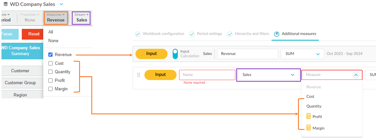 When you exit the setup screen, expand the dimensions rows in the worksheet to view the measures rows you added, along with the data that is pulled in from the selected streams. Colored bars help you to identify and differentiate the types of measures, for example, the input measure has a yellow bar. You can hover over these bars to view the measure type name. The format of the measure values, such as percent or decimal place, comes from the underlying database. Where the formatting is not specified in the database, values are rounded to the nearest whole number.