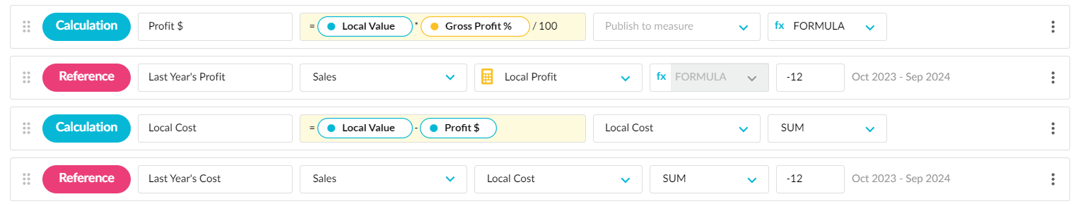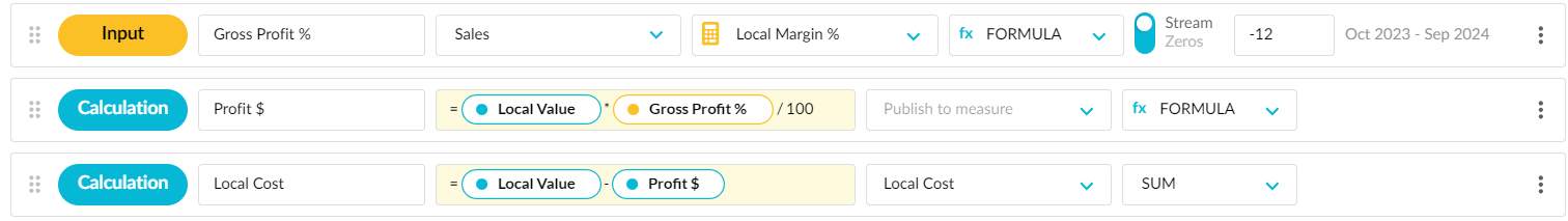 Add a Calculation row for Profit $ and enter the formula: = Sales Local Value * Gross Profit % / 100. There is no need to select a measure in this case.