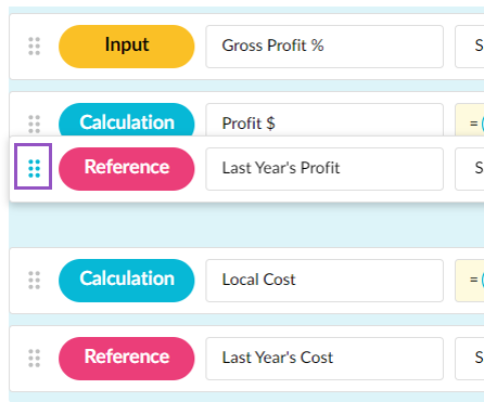 Click and hold the Move button on the left side of the row (a blue background displays), then drag the row up or down to its new position.
