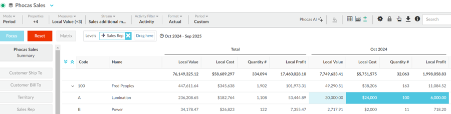 Some aggregation methods are more suitable than others, depending on the selected measure. For example, for a total, such as local value or quantity, SUM is the most suitable, whereas the FORMULA option is more suitable for margin %, as it calculates the value.