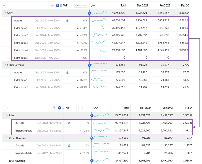 Reduce the number of measures: The inclusion of additional measures in operational budgets and in Database and Reference worksheet tabs might be required for some line items but not necessarily for all items in the worksheet. For example, you can add the Quantity and Price measures to calculate the Sales value for your products. If you have 100,000 products, that's a lot of additional rows. Do you really need to do these calculations right here in the budget? If you reduce the number of measures, you reduce the number of rows.