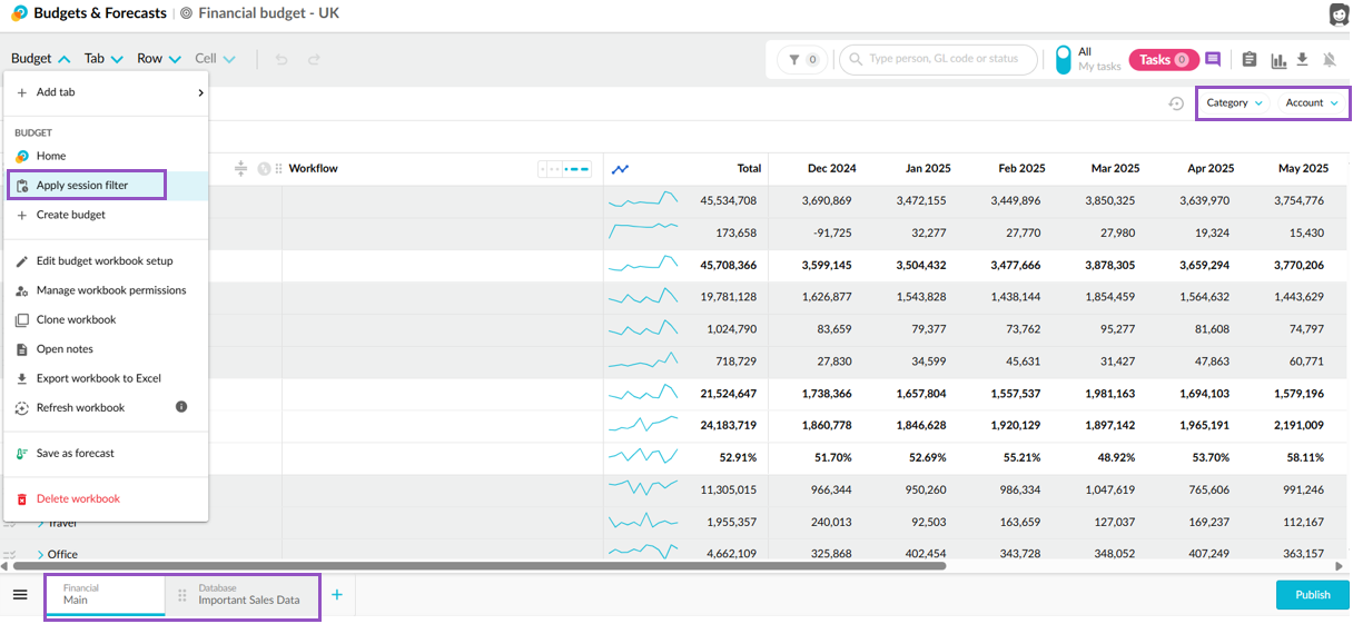 Before creating a budget workbook, rather than have all your budgeting data in one workbook, consider using a consolidated workbook approach. It involves splitting the planned budget up into multiple workbooks (subsets of data), carrying out the budgeting process in those individual workbooks, then bringing it all back together at the end. The consolidated workbook approach involves the use of several filtered workbooks that are all published into one stream. As a result, you substantially reduce the amount of data in each workbook, as each one has only the levels and tabs it needs.