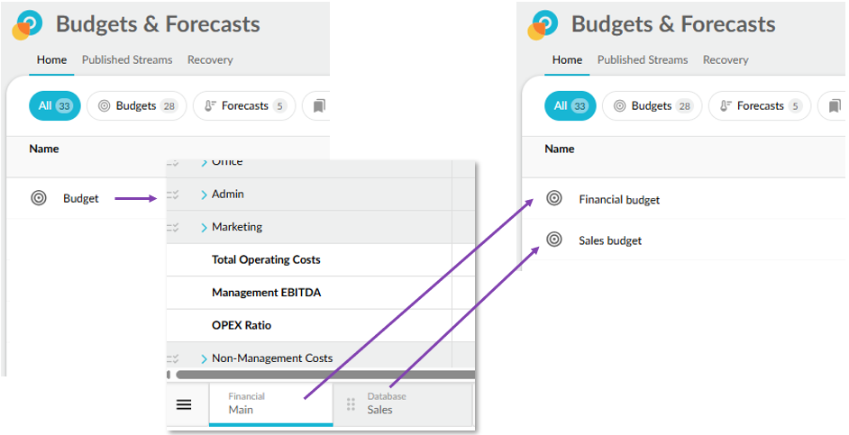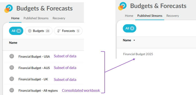 Then, as each workbook is completed, it can be published into the consolidated stream. The consolidated stream can then be viewed and analyzed in the Financial Statements module. Alternatively, the consolidated stream can be viewed in the Budgets & Forecasts module by setting it as the baseline stream in the consolidated workbook that was created earlier in the process.