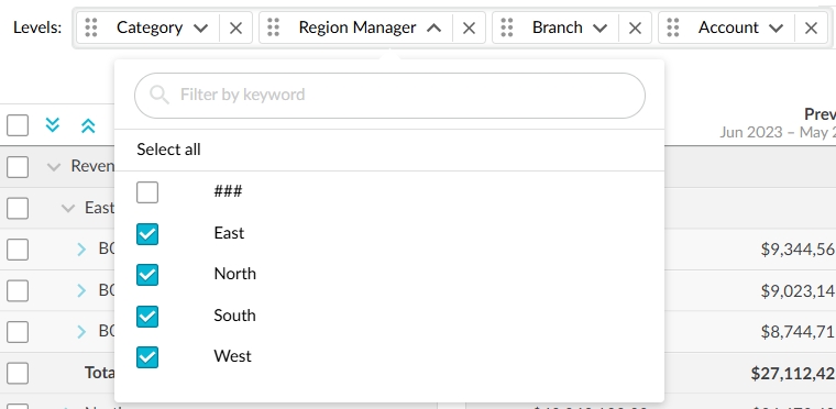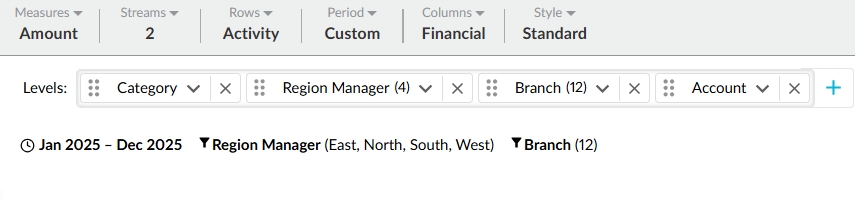 Add the applicable dimensions as levels in the statement. This creates a nested view of your financial information, where you can expand the levels at which you want to budget. Ensure the levels are nested in the correct order to match your budget structure. In this example, the levels are Category > Region Manager > Branch > Account.