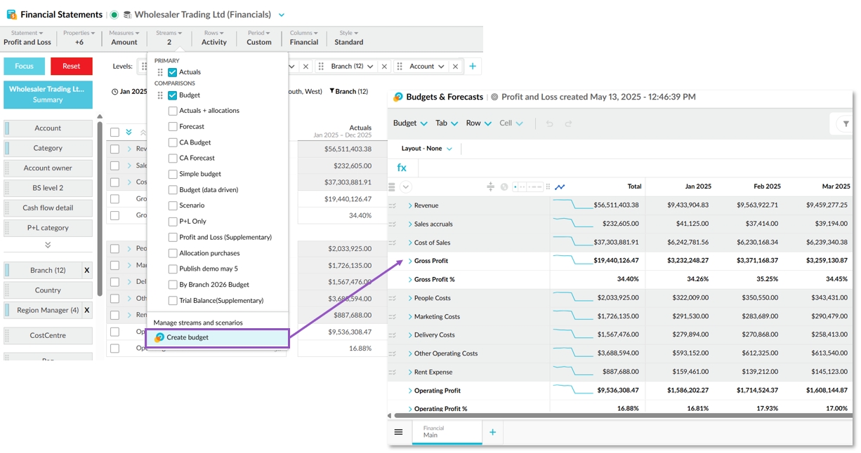 The Financial Statements and Budgets & Forecasts modules work together to provide a comprehensive budgeting solution catering to several scenarios. This page explains how to combine the features of both modules to budget effectively by region and branch. You can adapt this information to meet your individual needs.