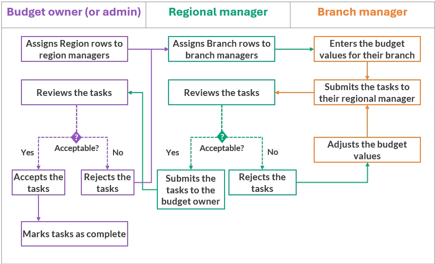 The workflow status of each row is clearly visible to everyone involved in the budgeting process. You can use the workflow history, workflow comments, and cell comments to keep track of what's happening.