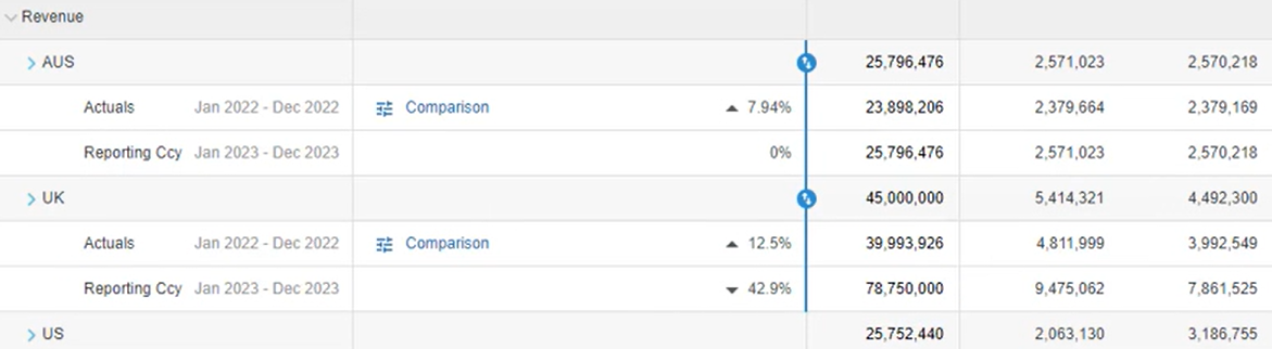 For example, suppose you have a budget in which there are three regions, Australia, the UK and the USA and you want to budget those regions in both their local currencies (AUD, GBP and USD) and in one common currency, AUD, as that is where your head office is located.