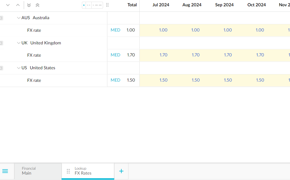4. In the Lookup tab, enter the FX rates for each country across the period.<img src="https://content.gitbook.com/content/aNH5UMuZXBHuAbFF7nI2/blobs/GpUGln8zC4atPW6yBHbf/3623944377.png" alt="" data-size="original">