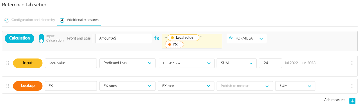 1. Enter a formula into the first period cell of the first additional measure row (Local Value) that refers to the corresponding cell in the Main tab and press **Enter**. See [Use formulas](https://docs.phocassoftware.com/budgets-and-forecasts/contributor/edit-values-in-a-worksheet/use-formulas).