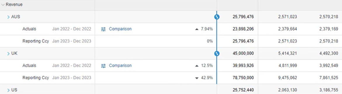 This method allows you to view the resulting currency conversion in Financial Statements immediately after publishing the local currency values from Budgets & Forecasts. Whereas you can use a Reference tab in the budget to display the resulting transformation from local to reporting value, the reporting value does not update in real-time within the budget. You need to both publish the budget and refresh the page to view the updated reporting currency.