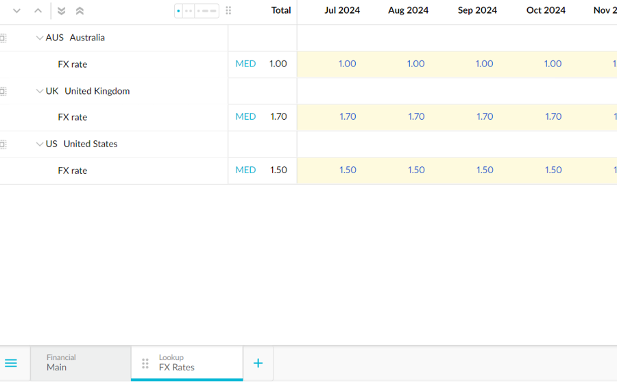 For example, suppose you have a budget that includes three regions: Australia, the UK, and the USA. You want to budget for those regions in their local currencies (AUD, GBP, and USD) and in one common currency, AUD, as that is where your head office is located.