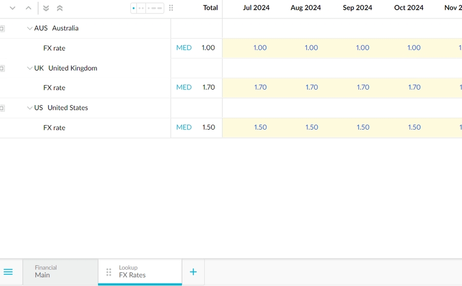 A Reference tab with multiple measures (driver-based budgeting) to convert your budgeted local currency values to your reporting currency values. The reporting values are calculated by getting the local values from the Main tab and multiplying them by their respective exchange rates from the Lookup tab.