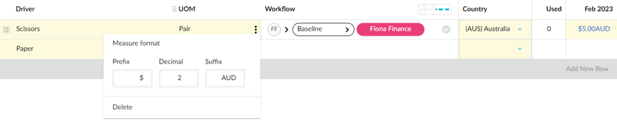 Click the menu button in the UOM cell of the row to open the Measure format window. Enter the prefix, number of decimal places, and suffix as required, then click out of the window.