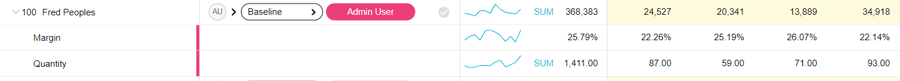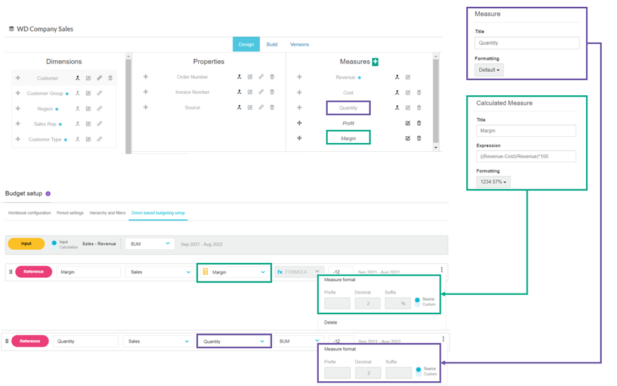If you have access to Designer, you will be able to check the format of the measures in a database. In the following example, additional measures were added to a Sales budget, taking the source format from the corresponding measures in the underlying database. Both the Quantity and Margin measures have two decimal places and the Margin also has a percentage sign suffix.