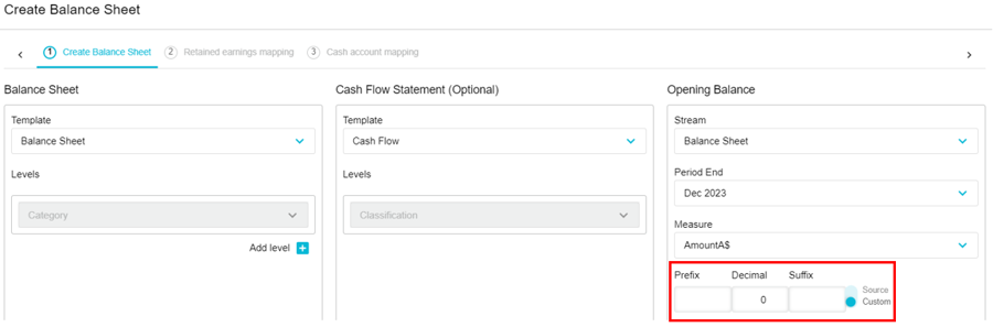In the Balance Sheet tab, you can switch between the source formatting (which comes from the selected measure) and your custom formatting.