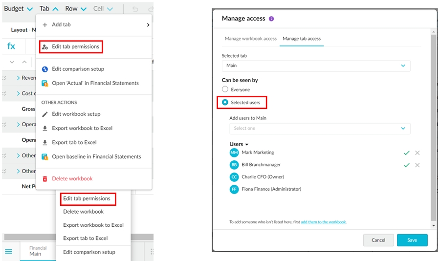 The following steps outline how to manage tab permissions from within a workbook. You can also initiate this action from the Budgets & Forecasts homepage.