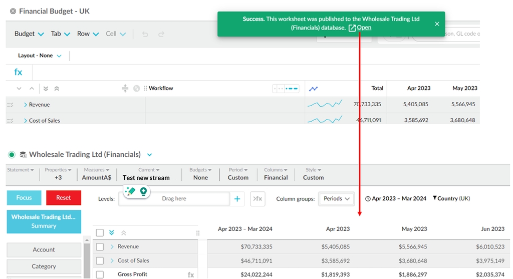If you published to a stream, a success message displays at the top of your screen. Click the Open link to view the published stream in the underlying database, where you can analyze the data immediately. Operational databases, such as Sales, open in the Analytics module, whereas financial databases open in the Financial Statements module. The stream is opened in the same configuration as the budget, including any levels, dimension filters, budget filters, and budget period, as in the following image.