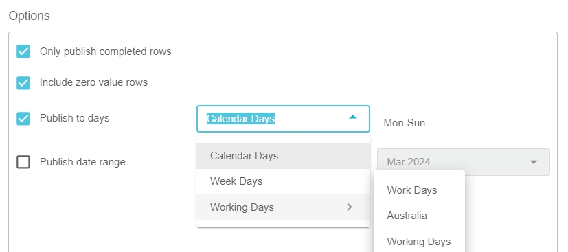 This option overrides the default behavior whereby the budget period value is published into the first day of that period. It splits the budget period value proportionally by the number of days in the budget period and publishes the data to each day in the period. Select the checkbox, then select one of these options to calculate the number of days: