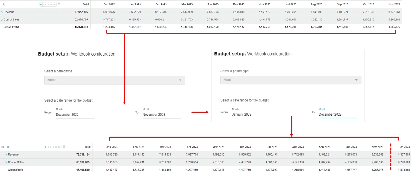 To maintain a rolling budget, you roll the budget forward into the next period by editing the dates in the budget setup, as illustrated in the image below. This process adds one or more period columns to the end of the budget period, while at the same time, removes one or more period columns at the beginning of the budget period, according to your selected date range.