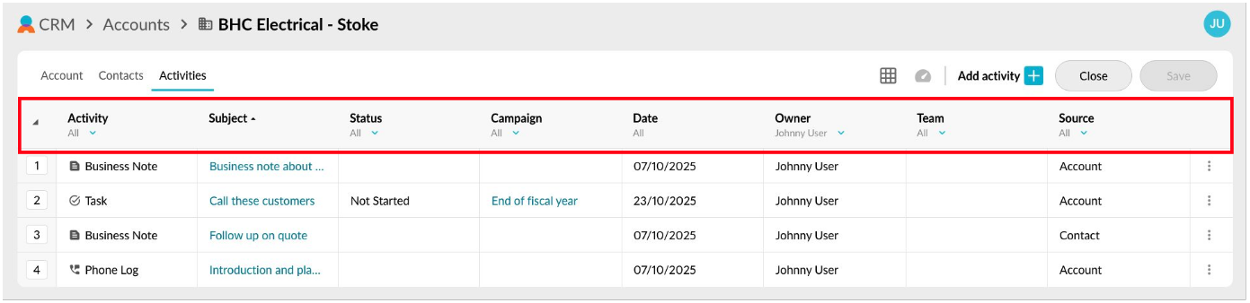 Column filters are only available in the **desktop version** of CRM. To find the activity you need in the mobile-friendly version of CR&#x4D;**,** type your search term into the box and any matching results will instantly be displayed.