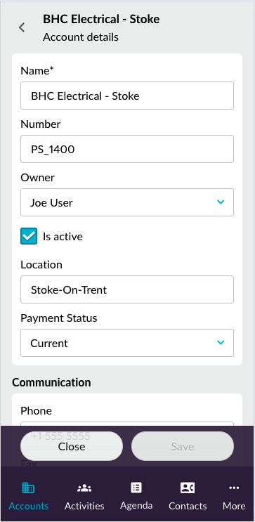 <table><thead><tr><th width="172">Field</th><th width="143">Field type</th><th>Description</th></tr></thead><tbody><tr><td>Name</td><td>Free text</td><td>Typically the name of the company. Mandatory field.</td></tr><tr><td>Number</td><td>Free text</td><td>Usually a code number, often internally assigned, to distinguish this company from others.</td></tr><tr><td>Owner</td><td>Dropdown list</td><td>The person who normally looks after this account. Owners are CRM users. The owner of an account can be different to the owner of the associated contacts.</td></tr><tr><td>Is Active</td><td>Checkbox</td><td>Active accounts typically include companies that are currently doing business with you. Inactive accounts might be old customers or suppliers who no longer trade with you. Rather than delete the entire account and its history, it is often better to mark these companies as inactive. Select the checkbox to mark active, or leave it empty for inactive.</td></tr><tr><td>Location</td><td>Free text</td><td>Typically indicates a region or territory.</td></tr><tr><td>Payment status</td><td>Dropdown list</td><td>In our example, we use payment status to indicate ‘current’ or ‘overdue’.  This is a customizable field that can be edited by administrators using<a href="../administration#edit-the-options-in-crm-dropdown-lists"> picklists</a>.</td></tr></tbody></table>