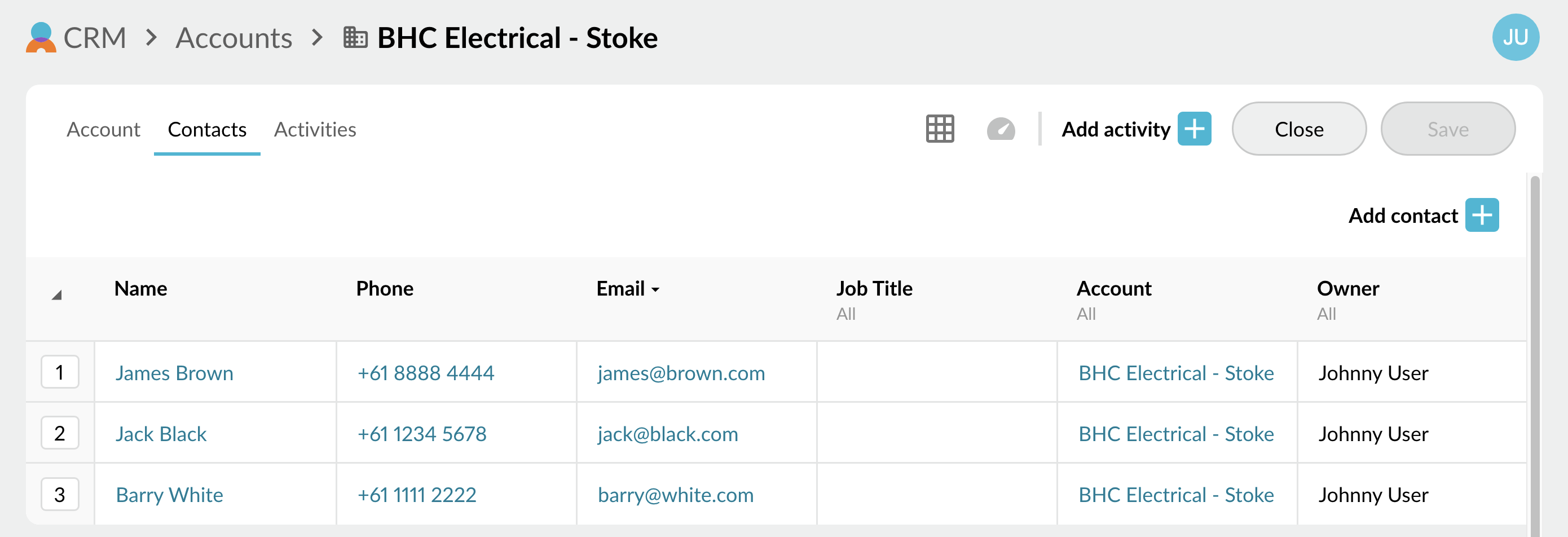 A message displays at the top of the screen to indicate if the account has been successfully added (or otherwise). If successful, new tabs and buttons display, allowing you to [add contacts](https://docs.phocassoftware.com/crm/contacts#addanddeletecontacts-addacontacttoanaccount) or [add activities](https://docs.phocassoftware.com/crm/activities#add-an-activity) to the new account.