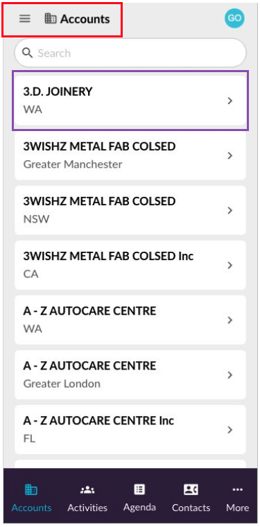 On the **Accounts** screen, select the account name to open the account record.
