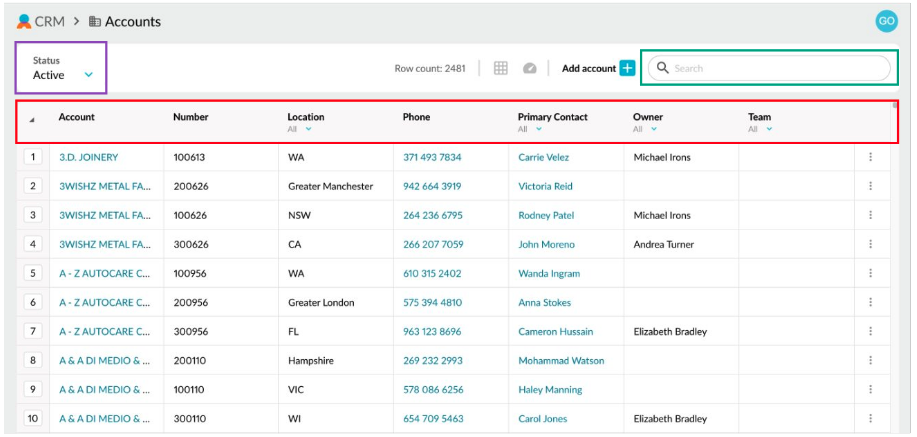 On the **Accounts** screen, you can find a particular account using the filter and search options above the grid or by sorting the list.&#x20;