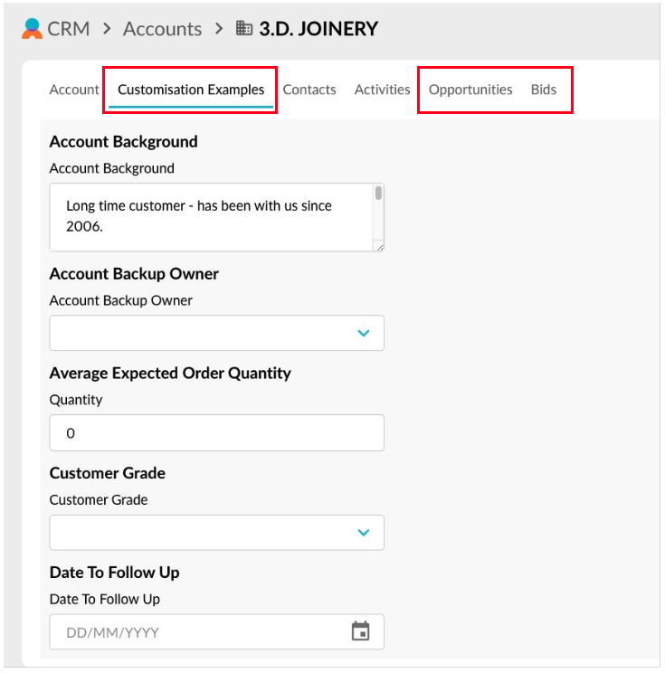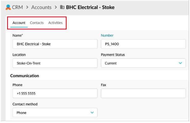 An account record contains three standard tabs (**Account**, **Contact** and **Activity**) that each contain several fields. Your administrator might also add custom tabs containing additional fields and/or add custom fields to the **Account** tab.&#x20;