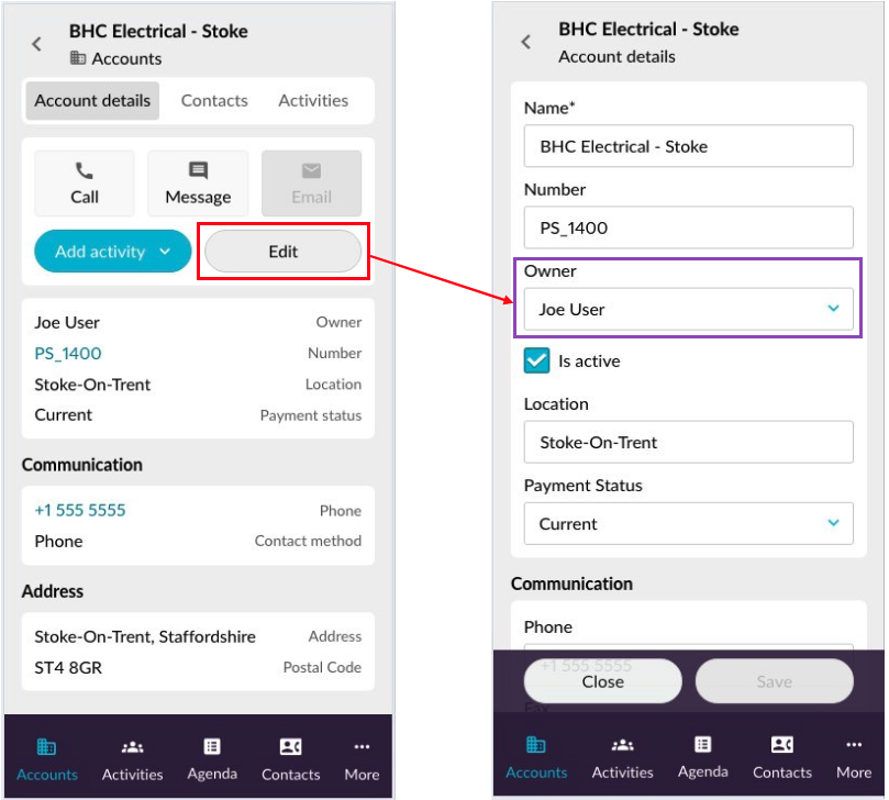 Suppose your company is assigning the *BHC Electrical - Stoke* account to its new account manager, Joe. You need to update this information in CRM.&#x20;