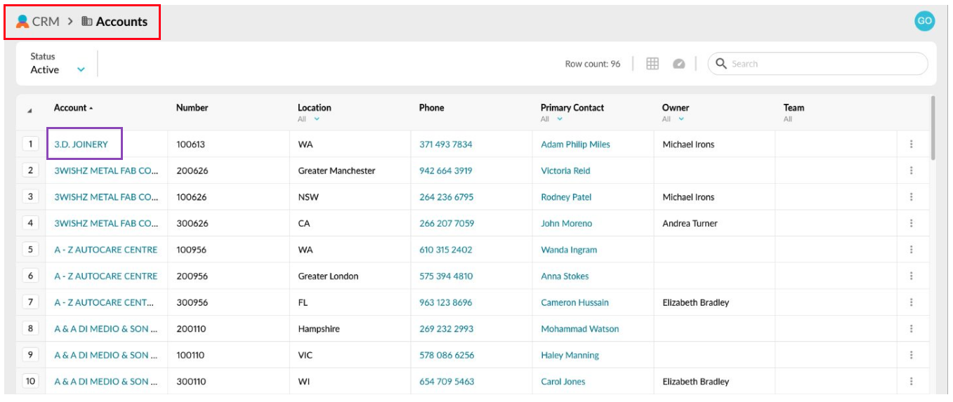You can also open accounts from other screens in CRM (where the account name appears in blue as an active link) and from within Analytics ([see below](#viewandeditaccounts-openanaccountrecordfromwithinanalytics)).&#x20;