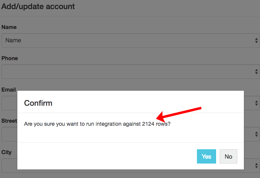 If you do NOT select any rows in the grid before selecting the Add/update account option, it is possible that you could inadvertently add or update all customers in CRM. In this case, you will get a confirmation message displaying the number of rows you are about to include in the integration.