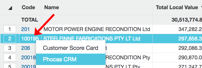 Locate and select the customer row (it turns blue), then click the code > Phocas CRM.